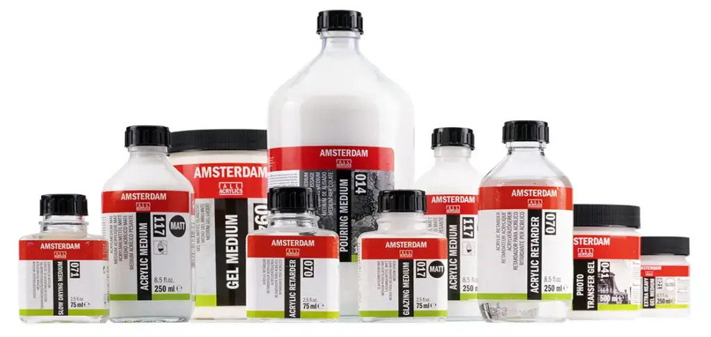 Amsterdam tilbyr et komplett sortiment av hjelpemidler til akrylmaling. Serien omfatter bindere, grunninger, medier, effektprodukter og fernisser – utviklet for å gi stabile underlag, kreative uttrykk og varig beskyttelse. Alle produktene er fullt kompatible med Amsterdam Standard og Expert akrylfarger.
