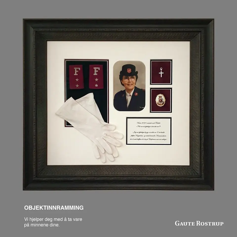 Disse objektene ble montert på velur i fargene til Frelsesarmeen, sort og burgunder. Dobbel passepartout med den motsatte fargen av det objektet var montert på. En nøytral passepartout på toppen for å binde alt sammen. To flotte rammer satt i sammen for å skape den rette dybden
